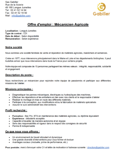 En perpétuelle évolution, la SAS Gabiller a su s’adapter pour répondre aux attentes de ses clients et leur proposer des services adaptés. Ainsi, depuis 2011, ce sont plus de 40 nouveaux partenariats qui ont été signés avec des constructeurs de matériels agricoles, de matériels espaces verts, mais aussi de bricolage et d’alimentation animale pour offrir toujours plus de solutions. L’équipe s’est elle aussi étoffée au cours des années, pour intégrer de nouvelles compétences et apporter toujours plus de réactivité et de services à ses clients.